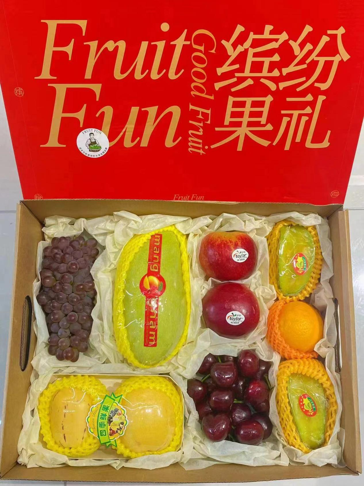 果缤纷的“缤纷果礼”,就如同老师们的课堂,总是充满惊喜与丰富。打开礼盒,各色优质水果错落有致,那紫得发亮的葡萄,似老师在黑板上写下的娟秀字迹,颗颗饱满,蕴含着知识的甘甜;红彤彤的苹果,像老师给予学生的关怀,圆润温暖,带着满满的祝福;还有黄澄澄的芒果、橙黄的橙子等,每一种水果都精心挑选,正如老师对每一位学生的用心栽培,力求把最好的“养分”传递。